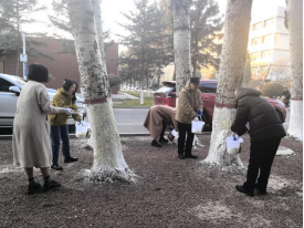 随后,校园管理服务中心工作人员现场讲解树木养护要点、涂白剂调配及操作规范。培训结束后,党员干部分工协作,调制剂液、清理树干、粉刷涂白,在鲜红党徽映衬下干劲十足,一排排树木很快穿上“白大褂”,筑牢了防冻防虫的安全防线。